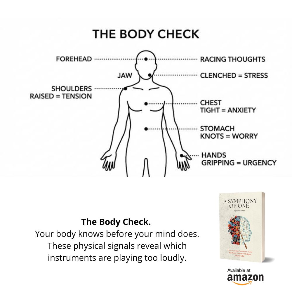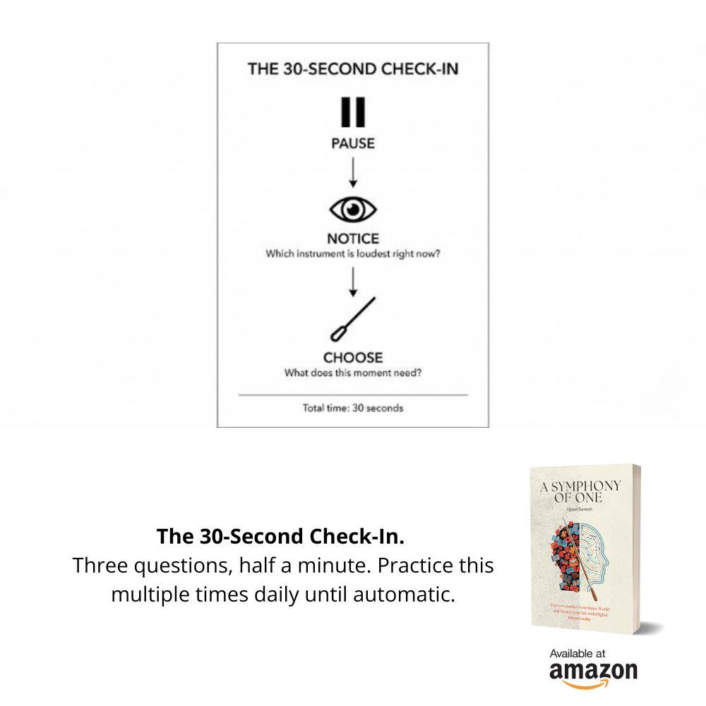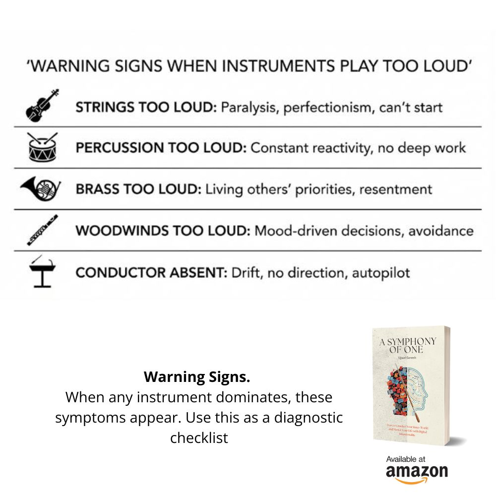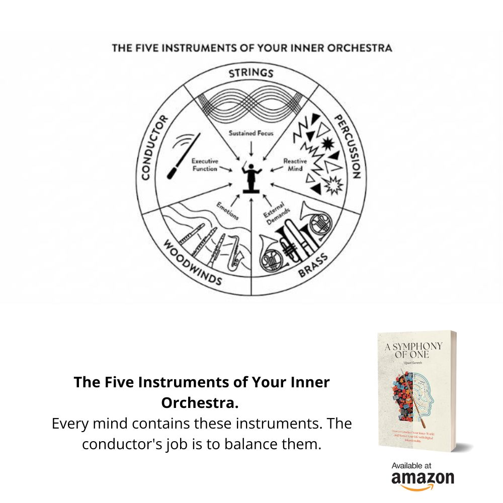 Inside you, five instruments constantly compete. The Strings (deep focus). The Percussion (reactive impulses). The Brass (external demands). The Woodwinds (emotions). The Conductor (you, when intentional). Without conducting, you get chaos. With it, harmony.